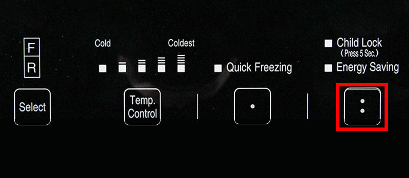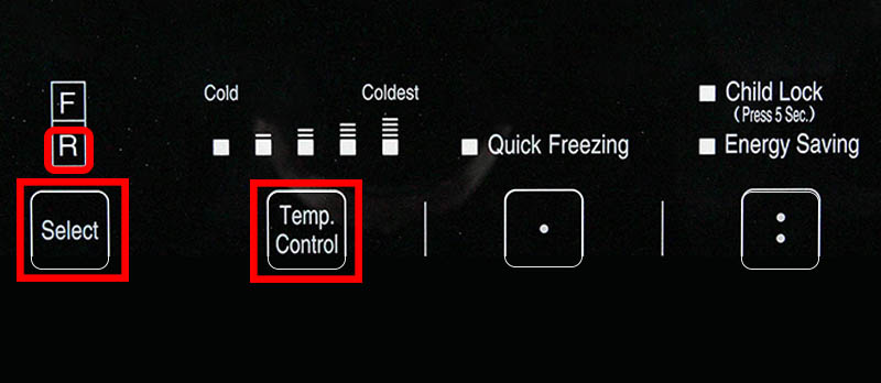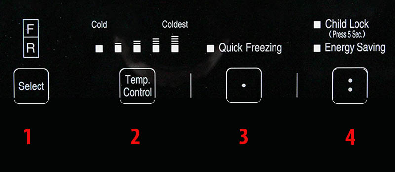 Bước 1: Chạm nút Select (1) để chọn ngăn mát. Lúc này đèn “R” sẽ sáng lên.