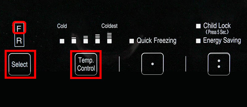 Bước 1: Chạm nút Select (1) để chọn ngăn đông. Lúc này đèn “F” sẽ sáng lên.