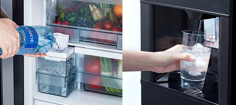 Tủ lạnh Hitachi thiết kế tính năng này giúp hạn chế tình trạng thường xuyên mở tủ lấy nước gây thất thoát hơi lạnh và hao tốn điện năng. Do vậy, bạn chỉ cần đổ đầy nước vào bình chứa, tủ lạnh sẽ làm lạnh nước. Lúc này, bạn chỉ cần để ly vào khay nước bên ngoài là có thể thưởng thức được ngay một ly nước mát lạnh. Bình chứa nước này có thể tháo rời giúp việc vệ sinh được thực hiện đơn giản hơn.
