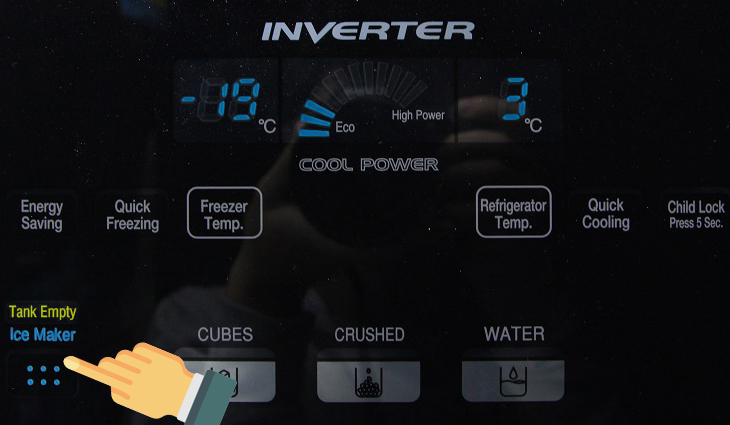 - Bạn đang cài đặt chế độ của tủ là "Energy Saving". Bạn hãy tắt chế độ Energy Saving đi bởi với chế độ này, tủ lạnh sẽ chỉ duy trì nhiệt độ tối thiểu để tiết kiệm điện và vì thế tính năng làm đá tự động có thể bị chậm lại hoặc ngừng hoạt động.